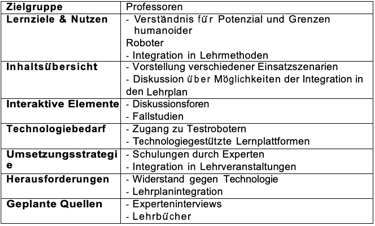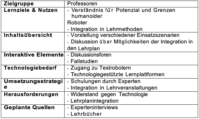 Die Trainings fu ̈r Professoren konzentrieren sich darauf, die vielfa ̈ltigen Einsatzmo ̈glichkeiten humanoider Roboter im Lehr- und Forschungsbereich zu erkunden. Dazu geho ̈ren die Integration von Robotern in Lehrveranstaltungen, die gemeinsame Erstellung von Lehr- materialien mit den Robotern und ihre Nutzung zur individuellen Betreuung von Stu- dierenden. Die Trainings umfassen auch die Implementierung interaktiver Lehrmethoden mithilfe der Roboter, um das Lern- und Lehrerlebnis zu verbessern.