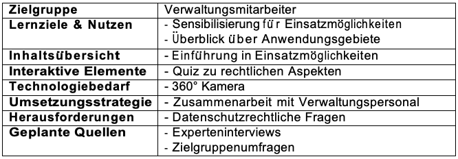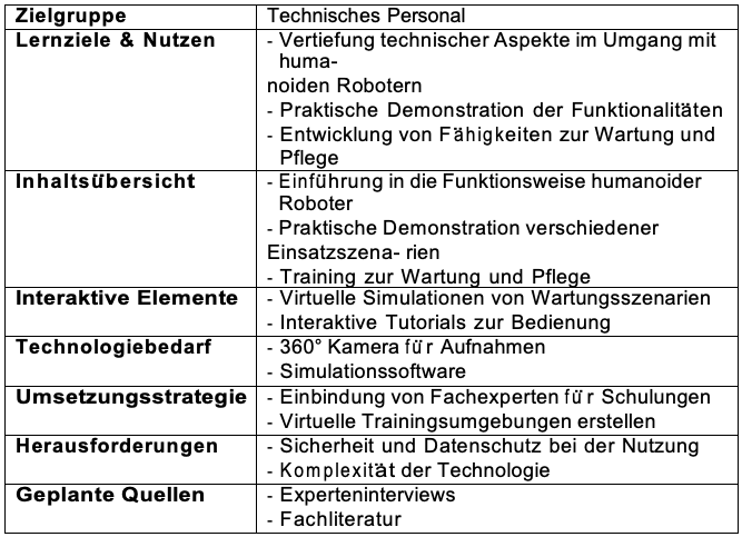 Fu ̈r die Verwaltungsmitarbeiter liegt der Schwerpunkt darauf, wie sie die Integration humanoider Roboter nutzen ko ̈nnen, um ihre administrativen Aufgaben zu optimieren. Dazu geho ̈ren Themen wie die effiziente Planung und Durchfu ̈hrung von Veranstaltungen unter Einsatz der Roboter, ihre Integration in die Kommunikation mit Studierenden und Mitarbeitern sowie ihre Nutzung zur schnellen Bereitstellung relevanter Informationen. Das technische Personal wird umfassend darauf vorbereitet, die humanoiden Roboter zur Unterstu ̈tzungbeiderWartungundU ̈berwachungdertechnischenInfrastrukturdesCam- pus einzusetzen. Hierbei werden Themen wie die sichere Handhabung der Roboter, die Diagnose von technischen Problemen mit ihrer Hilfe und ihre nahtlose Integration in be- stehende Wartungs- und U ̈berwachungsprozesse behandelt. Zusa ̈tzlich werden Trainings zur regelma ̈ßigen Wartung und Pflege der Roboter angeboten, um einen sto ̈rungsfreien Betrieb sicherzustellen.
